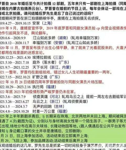 这段时间娱乐圈事情很多,大家一边吃瓜一边讨论,女顶流被滞留迪拜,薛之谦被喊话,还牵扯到张杰和谢娜,很多人觉得已经够乱了,结果又有狗仔在这个时候跑出来说起唐嫣和罗晋,让不少网友心里又开始不安。 事情的起因,是这几个月里,关于唐嫣和罗晋婚变的传闻一直没断过,早一点的时候,有人爆料说一对在内娱一直被当成恩爱夫妻的明星已经离婚了,很多人就开始猜测是不是唐嫣和罗晋,后面又有人把两人这几年各自工作的行程扒出来,说两人长期不在一起,一个忙着拍戏,一个也在各地工作,孩子出生的时候罗晋也很忙,长期异地对感情影响很大,还有人看了两人的商业资料,说两人之间在公司和股票上没有什么共同的地方,没有共同持股,也没有股权交叉,觉得和很多明星夫妻不太一样,明星夫妻通常会有一些合作项目,这些一点一点的内容,都被拉出来当成“婚变”的小证据。 就在大家议论得很厉害的时候,突然传出罗晋父亲离世的消息,很多人这时才明白唐嫣和罗晋为什么一直不回应各种传闻,因为家里有这么大的变故,两人肯定都在忙着处理家事,根本没有心思跑出来解释什么。 后来有网友在罗晋父亲的葬礼上拍到唐嫣和罗晋同框的视频和照片,还有唐嫣父亲的身影,有人说他们后面还一起吃饭,这些画面传出来后,很多人觉得婚变的传闻应该可以告一段落了,大家以为事件会慢慢过去,网上也会安静下来一阵。 过了没多久,又有人拍到罗晋带着母亲去大孤山祈福的照片,这件事本来很普通,很多人在家里遇到事情后都会去祈福,去大孤山的人也非常多,可就在这个时候,又有人拍到了任素汐出现在大孤山的画面,因为罗晋曾经和任素汐一起拍过《时差一万公里》,在戏里演过一对搭档,有网友就开始各种猜想,把这些画面硬扯在一起,有人说是不是他们一起去的,又有人盯着照片问为什么看不到唐嫣,为什么这种时候不是全家一起,类似的话一冒出来,原本已经安静了一点的流言又被炒起来。 这一次刘大锤在直播里又提起这对夫妻,说唐嫣一直在北京拍戏,在北京期间住的是酒店,说他从来没有见到罗晋在旁边出现,说得很含糊,却又让人容易往不好的方向去想,还说什么只要人家不公开,我们就只能猜,人家要是不公开那天,他怎么解释都说得通,用这种方式让网友自己去脑补,很多人听完之后觉得他是在暗示两人感情有问题。 唐嫣之前在接受采访的时候,说自己拍完戏回到酒店,会更喜欢一个人待着,有人拿这句话和狗仔的话放在一起,又开始解读她是不是在暗示什么,觉得内容有点意思。 对这一切,有一部分网友觉得这种爆料不太可靠,更像是在直播里随口一说,目的是吸引大家关注和讨论,没有拿出让人信服的证据,只靠几句模糊的话就往婚变方向引,有点过分,也有人觉得他们这几年同框次数的确少了,社交平台上也不再频繁秀恩爱,所以心里难免有怀疑。 回头看两人的感情,从一开始其实是很被大家看好的,当年他们合作了好几部戏,从《乱世佳人》到《X女特工》,再到《克拉恋人》,两人一起演戏的次数多了,关系慢慢变近,那时候网上就有很多人说他俩应该在一起,荧幕上的互动很好看,男的帅女的美,站在一起很搭,后来他们公开恋情,发的文字也很甜,很多粉丝和路人都替他们高兴。 再后来两人结婚时,罗晋配的那句“新郎是我”也让很多人印象很深,他们一起出席活动、一起走红毯的时候,罗晋基本都会牵着唐嫣的手,那个时候大家提到85花里谁的恋爱比较顺利,很多人都会提到唐嫣,觉得她的婚后状态很好,整个人更自信,气质也变得不一样。 到了近几年,两人慢慢不再那么爱在公众面前表达感情,不再频繁同框,不怎么在网上互动,很多人的印象就变成只知道他们很久没一起出现了,于是只要网上一有人提一句,两人的名字就容易被扯进婚变的传闻里,感觉只要有一点小动静,就会被无限放大。 狗仔的新一轮爆料算是把过去的那些猜测又翻出来再烤一遍,让不少人心里又紧张起来,也有不少老粉在评论里说自己还记得当年官宣时的开心,也不愿意轻易相信这些没有证据的说法。 整件事走到现在,起因是网友对他们感情状态的好奇和各种细节的猜测,中间有狗仔爆料、有行程对比、有商业信息分析、有亲人离世带来的沉默,也有祈福照和同框照引发的议论,结果就是关于婚变的声音一阵高一阵低,一会被葬礼同框压下去,一会又被新的只言片语挑起来。 对于很多一直关注他们的人来说,这些事情带来的不只是八卦,还有一种复杂的情绪,一边记得他们曾经公开恋爱和结婚时带来的那种甜感,一边又在现实的各种传闻里感到不安,大家在讨论时会有担心、会有怀疑,也会有理性提醒别人不要被带节奏,这些情绪交织在一起,让这段感情在大众眼中显得格外敏感,仿佛只要有一点风吹草动,就会重新被推到议论中心。